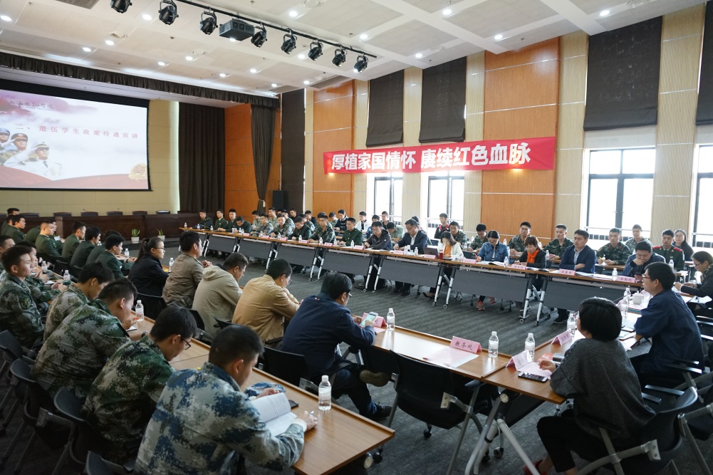 胡晟向光荣退伍、载誉归来的同学们表示热烈欢迎。他说学生携笔从戎的爱国行为十分可贵,也是人生中一段宝贵财富。经历了军旅生活的洗礼,军人的优秀品质必将对同学们今后的生活、学习产生积极深远的影响。针对退役复学学生遇到的问题,胡晟要求相关职能部门、各二级学院要提高思想认识,从立德树人的大格局出发,在思想、学业、生活上关心爱护退役学生,要关注他们的诉求,解决他们复学后面临的现实问题,为退伍学生的成长成才营造良好的氛围。他向全体退伍学生提出了三点希望:一是坚定理想信念,厚植家国情怀,继续保持军人的优良作风;二是克服各种困难,提前做好职业规划,努力完成学业;三是发挥引领示范作用,积极传递正能量,用自身行动鼓舞和感染周围的学生,成长为社会主义合格建设者和可靠接班人。