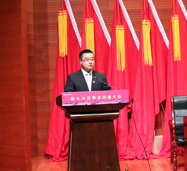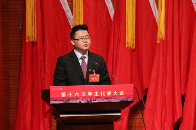 上海市学生联合会执行主席徐少东致辞,对过去四年上海电机学院十五届学生会的相关工作表示充分肯定,并对十六届学生会提出要“自我教育、自我管理、自我监督、自我创造”的要求、弘扬“时不待我,只争朝夕”的精神、彰显“明德至善 博学笃行”的校训精神以及不断深入群团改革的殷切希望。