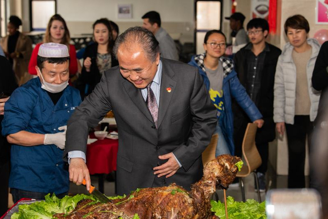 席间,胡晟校长在参加完市政协会议后赶到联欢会现场致新春贺词,他总结了这一年来上海电机学院的成绩和收获,肯定了学校在学生管理、科研和竞赛等方面取得的成就与进步,同时展望未来,勉励师生们在新的一年继续将高标准、严要求贯彻于学习、工作及生活中,为电机学院的发展作出自己的贡献。在一片欢呼声中,胡晟切分烤全羊,将联欢会的气氛推至最高潮。