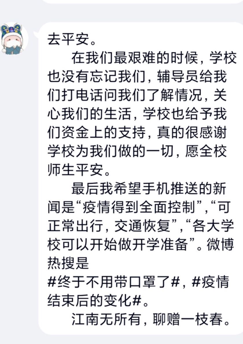 信息学院鲁同学,家在湖北省,辅导员张书娟老师与他一对一的联系,由于村里网络条件差,要跑到村口才能搜索到信号,于是每天约好时间与他保持联系一个多月来从未间断,在此期间了解到疫情对原本贫困的家庭更是雪上加霜,周边村子陆续报告的确诊病例、临近毕业却还没有着落的工作、父母不能正常劳作而几近荒废的田地……这一件件一桩桩让鲁同学内心的焦虑情绪与日俱增。就在这时学校以最快的速度将一份爱心送到他手中,让远在疫区的他倍感并表示:感谢学校为我雪中送炭,请老师放心,请学校放心,我一定会保护好自己、动员好周边,不放弃不抛弃,坚决助力打赢疫情防控阻击战